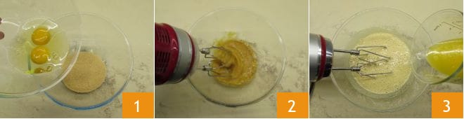 Para preparar los muffin de jengibre, empieza derritiendo la mantequilla a fuego muy bajo. Luego déjala templar. Asegúrate de que los huevos y la leche estén a temperatura ambiente, así conseguirás una masa perfectamente trabajada. En un bol, vierte el azúcar y los huevos 1, enciende las batidoras y mezcla durante unos 3-4 minutos 2. Cuando la mezcla esté más clara, añade la mantequilla derretida y templada 3.
