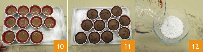 Colócalos todos en una bandeja 10 y hornéalos en el horno estático ya caliente a 175°, durante unos 30 minutos 11. Mientras los muffins cocidos se enfrían, prepárate para el glaseado. En un bol, vierte el azúcar glas y el agua 12.