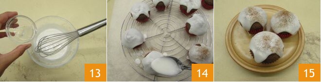 Añade unas gotas de jugo de limón 13, mezcla obteniendo una salsa densa y uniforme. Luego, glasea los muffins vertiendo cucharadas de glaseado: coloca los pastelillos en una rejilla y debajo un papel de horno 14. Espolvorea con una pizca de canela y tus muffins de jengibre estarán listos 15!