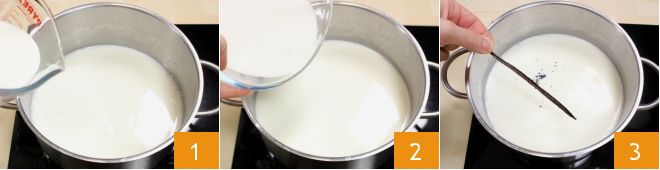 Para preparar las magdalenas de helado, comenzad con el Helado de stracciatella: en un cazo calentad la leche fresca entera y la nata 1, luego añadid el azúcar 2 y mezclad para que se disuelva: llevad la mezcla a rozar el punto de ebullición (si tenéis un termómetro, no debe superar los 83-84°). Abrid una vaina de vainilla a lo largo y extraed las semillas que podéis añadir a la mezcla de nata y leche junto con la vaina en infusión 3.