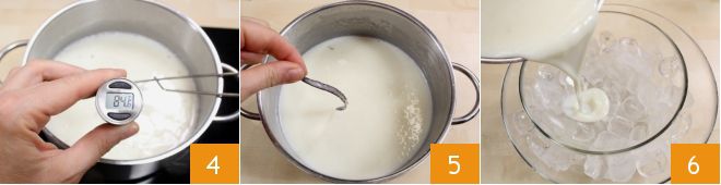 Una vez que la mezcla haya alcanzado la temperatura indicada 4, apagad el fuego, retirad la vaina de vainilla 5 y enfriad la mezcla vertiéndola en un bol frío sumergido en otro bol lleno de hielo 6 (o en la misma cacerola sumergida en un bol lleno de hielo).
