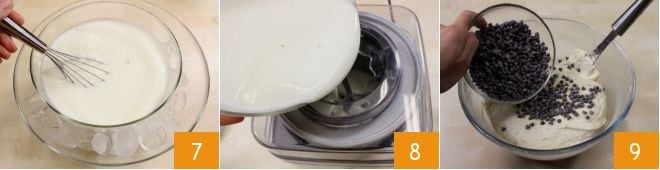 Mezclad la mezcla 7: esta operación enfriará inmediatamente la crema manteniendo intacta la consistencia. Colocad la mezcla en el frigorífico cubierta con film transparente y dejadla enfriar al menos 2 horas (o 1 hora en el congelador). Pasado el tiempo necesario, verted la mezcla en una heladera 8 y accionadla durante unos 30 minutos. Cuando haya alcanzado la consistencia cremosa adecuada, transferidla a un bol y añadid las gotas de chocolate 9.
