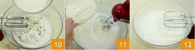 En este punto, añadid poco a poco la harina y la levadura tamizadas y trabajad la mezcla para integrar los ingredientes (10-11). Mezclad hasta obtener una crema homogénea y suave 12.