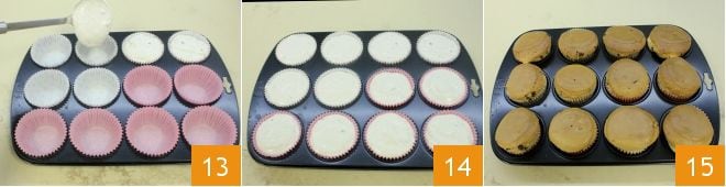Forrad un molde de 12 magdalenas con cápsulas de papel y verted en cada una el helado ayudándoos con un colador 13 o una manga pastelera con boquilla lisa, llenando las cápsulas hasta el borde 14. Hornead en horno estático precalentado a 170° durante aproximadamente 1 hora (a 150° durante 50-55 minutos si es horno ventilado). Una vez cocidas 15, sacadlas del horno y dejadlas templar antes de desmoldarlas y servirlas!