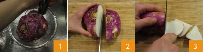 Para preparar los nabos glaseados, en primer lugar, lave los nabos bajo el agua corriente 1, luego séquelos y córtelos por la mitad 2 para rebanarlos más fácilmente, debe obtener rodajas de aproximadamente medio centímetro 3.