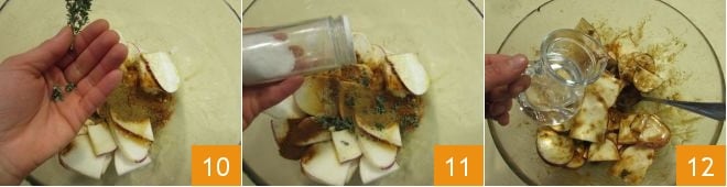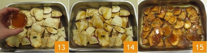 Mezcle bien para sazonar los nabos, luego transfiéralos a una bandeja para hornear y vierta los restantes 6 g de miel 13 sobre toda la superficie 14. Cocine los nabos en horno estático precalentado a 200° durante 35-40 minutos, rociando de vez en cuando la superficie de los nabos con el fondo de cocción. Una vez finalizada la cocción, saque del horno los nabos glaseados con miel y especias 15, déjelos enfriar un poco y luego sírvalos acompañando platos principales de carne o pescado