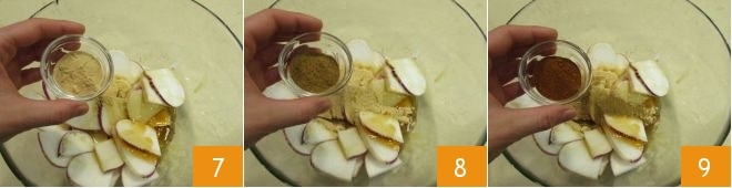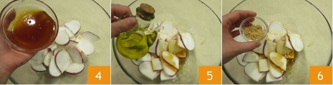 Transfiera los nabos cortados a un bol grande, vierta los 150 g de miel 4, sazone con aceite de oliva 5 y condimente con las especias en polvo. La mostaza 6