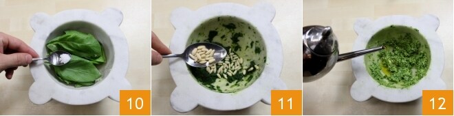 En este punto, procede a la preparación del pesto. Toma el albahaca y limpia las hojas, luego ponlas en un mortero. Ahora toma el ajo, pélalo y agrégalo al mortero con unos granos de sal gruesa 10. Tritura las hojas de albahaca hasta que salga un líquido verde brillante. Luego añade los piñones 11 y, sin dejar de mezclar, añade también el queso parmesano rallado y el pecorino. Finalmente, agrega el aceite en hilo continuo mientras sigues mezclando con el mazo 12. Cuando hayas obtenido una salsa cremosa y homogénea, tu pesto estará listo. Si no tienes un mortero, puedes usar una batidora, asegurándote de enfriar el vaso de la batidora en el refrigerador durante al menos una hora antes y teniendo cuidado de activarla a intervalos para que las cuchillas no se calienten.