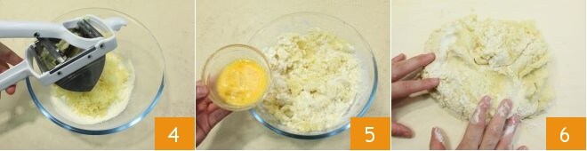 Ahora, con la ayuda de un prensador de patatas, tritura las patatas dentro del bol 4 y comienza a amasar. Luego ajusta de sal y añade un huevo batido 5. Posteriormente, continúa amasando enérgicamente con las manos hasta obtener una masa homogénea y suave al mismo tiempo 6.