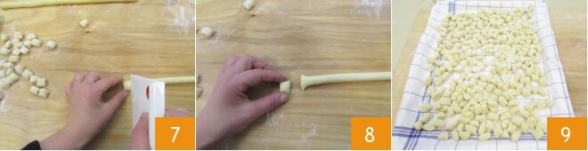 Después, crea cilindros de aproximadamente 1 cm de grosor con la masa 7. Utilizando una espátula de repostería, corta cada cilindro en pequeños trozos de aproximadamente 1 cm 8. Repite la operación para toda la masa. Luego, toma una bandeja, coloca un paño limpio encima, espolvorea con sémola y coloca las bolitas una a una 9.