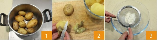 Para preparar las bolitas de patatas al pesto con mejillones y almejas, comienza con la preparación de las bolitas. Toma las patatas y lávalas bien para quitarles la tierra. Ahora toma una cacerola alta, llénala de agua, añade sal y lleva a ebullición. Luego, añade las patatas y déjalas hervir durante unos 30-40 minutos según el tamaño de las patatas 1 (puedes reducir el tiempo de cocción usando una olla a presión). Haz la prueba con los dientes de un tenedor para verificar su grado de cocción. Luego, aún calientes, pélalas 2. Ahora toma un bol grande y tamiza la harina en él 3.