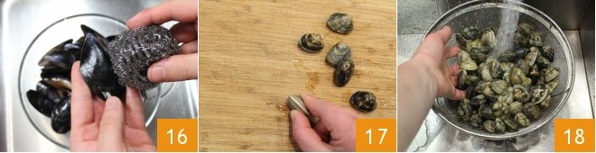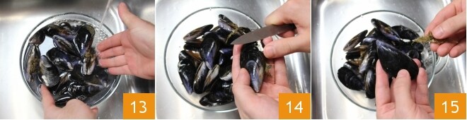 Ahora procede con la preparación de los moluscos. Comienza con la limpieza de los mejillones: enjuágalos bajo abundante agua corriente 13. Con la ayuda de un cuchillo, elimina incrustaciones y percebes 14, luego tira del biso, la barba que ves salir de las valvas 15.