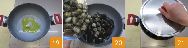 Ahora que los moluscos están limpios, toma una sartén antiadherente de bordes altos. Añade un chorrito de aceite y dora un diente de ajo 19 para darle sabor. Luego, añade mejillones y almejas 20. Tapa la sartén con la tapa y deja que mejillones y almejas se abran 21 a fuego vivo durante algunos minutos hasta que los moluscos se hayan abierto.