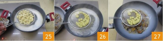 En este punto, toma una cacerola alta, añade agua junto al líquido de cocción restante de los moluscos y lleva a ebullición. Añade las bolitas, si prefieres usando una espumadera 25. Cuando las bolitas emerjan del agua estarán listas y podrás escurrirlas, ayudándote con una espumadera 26 para eliminar el agua de cocción. Luego únelas a la sartén donde has colocado los moluscos 27.