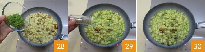 Añade también el pesto que habías reservado 28, ajusta de sal y pimienta 29. A fuego lento durante 2-3 minutos, mezcla bien los ingredientes unificándolos con la ayuda de una cuchara de madera o una espátula y tu plato estará listo 30. Luego decora el plato con los moluscos con concha que habías reservado y sirve estas maravillosas bolitas de patatas al pesto con mejillones y almejas.