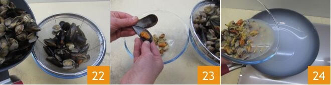 Una vez abiertos, escúrrelos con un colador colocado sobre un recipiente para filtrar su jugo de cocción 22 y resérvalo. Desconcha los moluscos, cuidando de reservar algunos que servirán para decorar tu plato 23. Añade los mejillones y las almejas con un poco de líquido de cocción en una sartén antiadherente 24.
