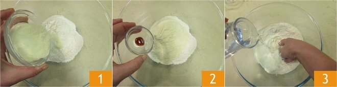 Para preparar el pan con levadura madre, comience con la masa. Coloque en un bol la harina 00 y la sémola 1, añada la malta 2 y vierta el agua a temperatura ambiente en un hilo mientras comienza a amasar con las manos 3.