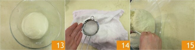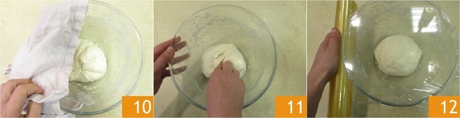Cubra con un paño 10 y deje reposar durante 15-20 minutos. Repita estas operaciones 3 veces más 11, para hacer 4 pliegues en total. Notará que la masa se volverá muy lisa. Cubra con film plástico 12 y deje fermentar durante 3 horas a temperatura ambiente.