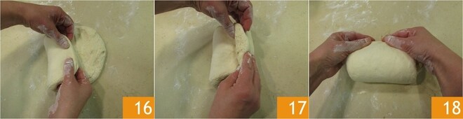 Aplánela ligeramente para formar un disco 16. Luego haga un pliegue en tres, llevando primero la masa de uno de los dos lados hacia el centro 16 y luego haga lo mismo con el otro lado 17. Apriete delicadamente para que la masa se adhiera y gírela haciendo que el pliegue quede hacia abajo 18.