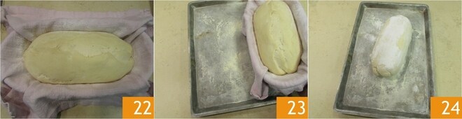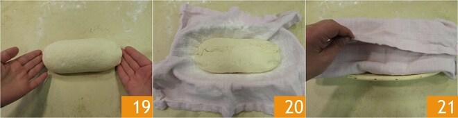 Estírela delicadamente para obtener una barra 19. Transfiera luego a la cesta del pan, esta vez colocando la abertura hacia arriba 20. Cubra con el paño 21 y deje fermentar nuevamente durante 2-3 horas.