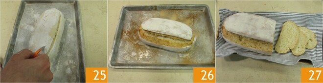 y con una cuchilla afilada realice un corte longitudinal a lo largo de todo el pan 25. En este punto, hornee el pan en el horno precalentado a 225° en modo estático, añada en el fondo del horno 10 cubitos de hielo, que al derretirse liberarán la humedad adecuada y hornee durante 20 minutos. Luego pase al modo ventilado y hornee el pan durante otros 10 minutos. Retire entonces el pan con levadura madre 26, transfiéralo a una rejilla y deje enfriar antes de servirlo 27.