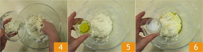Cuando el agua se haya absorbido, añada la levadura madre, refrescada el día anterior y en cualquier caso al menos 5 horas antes 4. Siga amasando. Añada el aceite 5 y la sal 6.