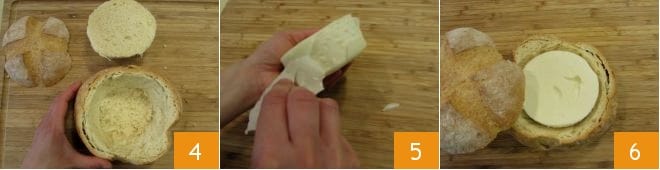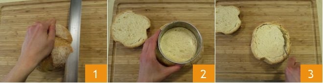 Para preparar el pan con queso fundido, empezad cortando la tapa de un pan de trigo duro de unos 16 cm de diámetro 1. Recortad con un cortador de 9 cm para eliminar la miga interior y para hacer el interior regular 2, extraed con una cuchara la parte interna 3 y reservad.