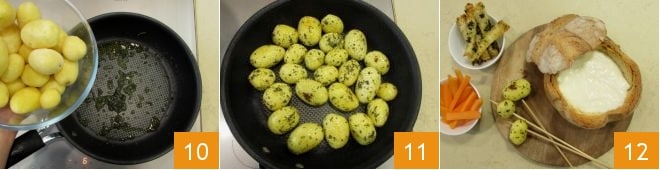 En la misma sartén, saltead a fuego vivo las patatas nuevas previamente cocidas (10-11). Sacad el pan del horno, colocadlo en el centro de la mesa sobre una tabla y servid el pan con queso fundido acompañado de picatostes de pan, patatas nuevas, zanahorias u otros ingredientes que prefiráis 12!