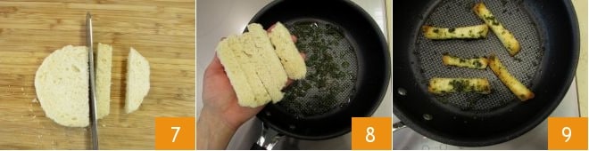 Cortad la miga reservada en bastones de unos 1,5 cm de grosor. Pon un poco de aceite en una sartén al fuego, una mezcla de hierbas aromáticas y la miga cortada 8, dorad durante unos 5 minutos a fuego vivo, hasta que estén bien dorados por todos los lados 9. Una vez listos, retirad los bastones crujientes y reservad.