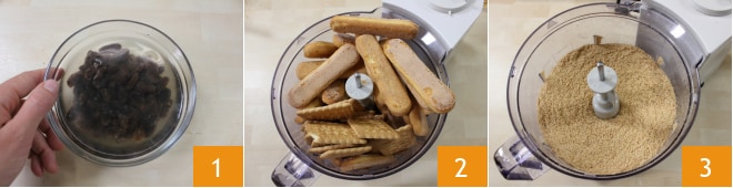 Para preparar el pan de muertos, comienza enjuagando y luego remojando las pasas en un cuenco con agua (como alternativa, puedes remojarlas directamente con el vin santo de la receta) 1. En el vaso de una batidora, vierte las galletas secas, los amaretti y (si es suficientemente potente) también los bizcochos de soletilla: si no caben, puedes hacerlo poco a poco 2. Acciona la batidora y reduce todo a migajas finísimas: transfiere la mezcla a un bol grande 3.