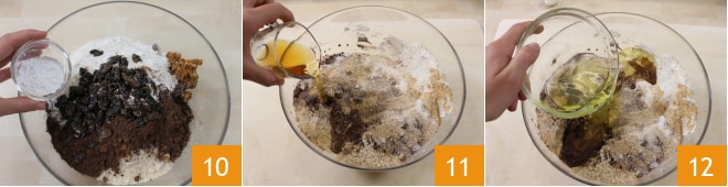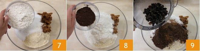 la harina 7, el cacao 8, una pizca de nuez moscada y la canela. En este punto, escurre y exprime bien las pasas y únelas a la mezcla 9,