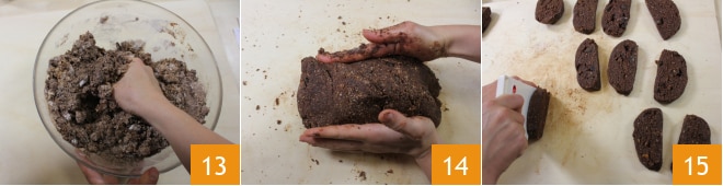 Comienza a amalgamar todos los ingredientes con las manos o, si prefieres, con una espátula o una cuchara de madera 13 y, cuando la mezcla esté suficientemente compacta, transfiérela a una superficie ligeramente enharinada y trabaja con las manos hasta obtener una masa homogénea y bastante consistente. Forma un bloque 14 y corta en rebanadas de 90-100 g cada una 15.