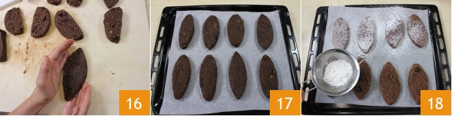 Modela las diferentes piezas para darles una forma bastante baja de aproximadamente 1 cm, hazlas alargadas de aproximadamente 12-15 cm de largo y 5-6 cm de ancho 16. Trata de no añadir harina en esta fase. Cubre una bandeja o una bandeja de horno con papel de horno y coloca tus panes de muertos, dejándolos a unos cm de distancia entre sí 17, en el horno tenderán a crecer un poco. Hornea las galletas en un horno precalentado a 180° durante aproximadamente 25 minutos, luego sácalas, espolvorea con azúcar glas 18 y déjalas enfriar. Sirve el pan de muertos solo después de haberlo dejado reposar durante al menos dos días, de esta manera se suavizarán bien.