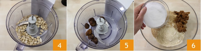 En la misma batidora, pon ahora las almendras y redúcelas a harina 4, luego únelas a las galletas trituradas. Ahora pasa también los higos secos por la batidora y agréguelos al bol 5. Añade a estos ingredientes el azúcar granulada 6,