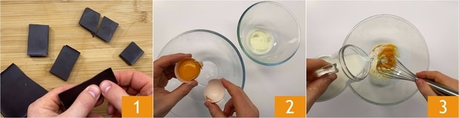 Para preparar los pancakes rellenos de chocolate, como primer paso, trocead la barra de chocolate para obtener 8 pedazos del mismo tamaño 1. Reservadlos y mientras tanto, derretid la mantequilla y dejad que se temple. Mientras tanto, separad las claras de las yemas en dos cuencos diferentes 2. Batid las yemas con un batidor y, mientras seguís mezclando, agregad la leche poco a poco 3, lentamente.