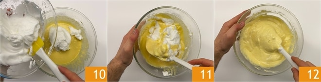 Incorporadlas delicadamente a la mezcla de huevos 10, con movimientos de arriba hacia abajo 11, para evitar que se bajen 12