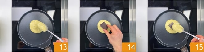 Poned a calentar a fuego medio una sartén amplia antiadherente, mejor si tiene el fondo grueso y, si es necesario, untad con un poco de mantequilla que extenderéis sobre la superficie con la ayuda de papel de cocina. Verted en el centro de la sartén 2 cucharadas de la mezcla 13, no será necesario extenderla. En el medio, colocad el trozo de chocolate 14 y cubrid con otra cucharada de mezcla 15.