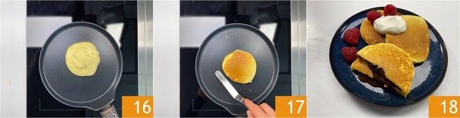 Cuando empiecen a aparecer burbujas en la superficie 16, dad la vuelta al pancake utilizando una espátula 10. Dejad dorar también el otro lado 17 y en pocos minutos estará listo. Repetid esta operación para los demás, obtendréis 8. Decorad con frambuesas y nata semi montada 18.