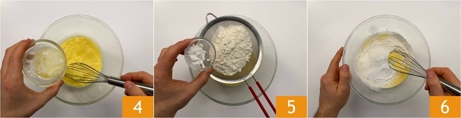 Cuando esté bien incorporada, añadid la mantequilla ya templada 4 y batid de nuevo con el batidor. Montad la mezcla hasta que esté clara. Tamizad la harina y la levadura en el cuenco 5, mezclad con el batidor para amalgamar 6.