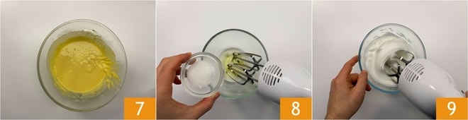 Debéis obtener una mezcla lisa, sin grumos 7. Ahora montad las claras que reservasteis, vertiendo poco a poco el azúcar 8 hasta que estén blancas y espumosas 9.
