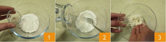 Para preparar los bollitos de avellanas, comienza por hacer la biga al menos 12 horas antes (puedes empezar la noche anterior para hornear al día siguiente). Vierte en un bol 50 g de harina 00, 1 g de levadura fresca desmenuzada 1 y, mezclando con un tenedor, añade en hilo 32 g de agua a temperatura ambiente 2. Luego amasa con la punta de los dedos 3