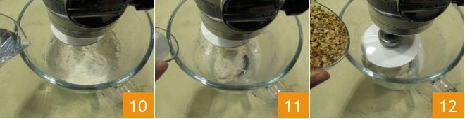 Acciona la batidora a velocidad moderada y vierte 150 g de agua a temperatura ambiente en hilo, poco a poco 10; amasa durante unos 5 minutos, luego añade 10 g de sal 11 y una vez absorbida, añade también 60 g de avellanas trituradas 12.