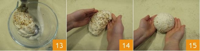 Continúa trabajando la masa hasta que esté bien amasada 13. En este punto, trasládala a una superficie 14, haz unos pliegues dando una forma esférica a la masa 15.