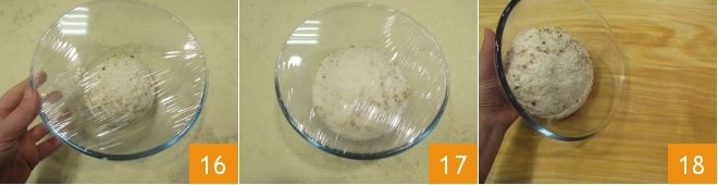 Colócala dentro de un bol, cubre con film transparente para alimentos 16 y deja que leude en un lugar cálido (el horno apagado solo con la luz encendida irá perfecto, se creará una temperatura de 26-28°) durante unas 4 horas o hasta que haya duplicado su volumen 17. Ahora transfiérela a una superficie de trabajo 18