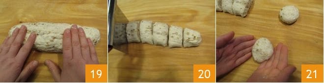 y con las manos intenta formar un cilindro 19 que dividirás en 6 piezas de unos 100 g cada una 20. Toma un trozo y utilizando la parte exterior de las manos hazlo rodar sobre la superficie para recrear una forma esférica 21.
