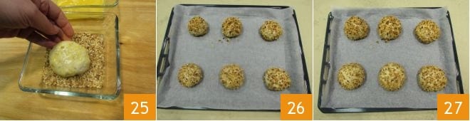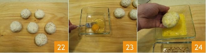 Repite la misma operación también para las otras 5 porciones de masa 22. En este punto, bate un huevo en un bol pequeño 23 y pasa cada bola primero por el huevo 24