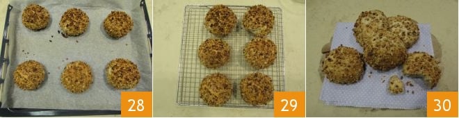 y luego por el granillo de avellanas 25, colocándolas poco a poco en una bandeja cubierta con papel de horno, asegurándote de mantener la parte con los pequeños pliegues en contacto con la bandeja para que no se abran al leudar 26. Deja leudar durante otras dos horas y media siempre en el horno apagado solo con la luz encendida (a 26-28°) 27.