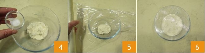 añade también 1/4 de cucharadita de sal 4 y amasa de nuevo. Cubre con film transparente para alimentos 5 y deja madurar a temperatura ambiente durante al menos 12 horas. Tan pronto como la biga esté madura 6 podrás ocuparte de la masa.
