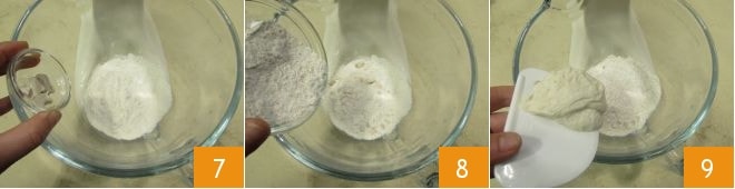 Vierte en el bol de una batidora con gancho 200 g de harina 00 y 5 g de levadura fresca ligeramente desmenuzada 7, añade 60 g de harina integral 8 y la biga que habías preparado antes 9.