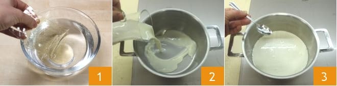 luego apaga el fuego e incorpora el azúcar glas tamizado 4, mezclando con una varilla 5 para disolver el azúcar. Ahora exprime bien las hojas de gelatina ablandadas 6